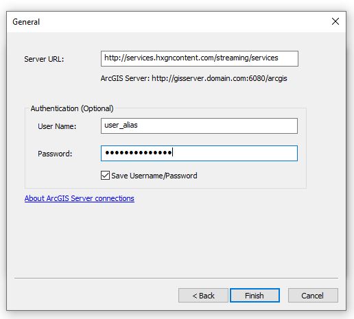 Under the Authentication (Optional) section, fill in your username and password. Select the “Save Password” box if you want ArcMap to remember your password. Click on “Finish.”
