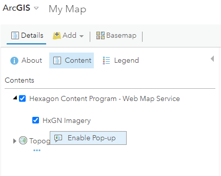 To access the GetFeatureInfo function, load the subscribed data layer using WMS. In the Content panel, select “Enable Pop-up” on the imagery layer.