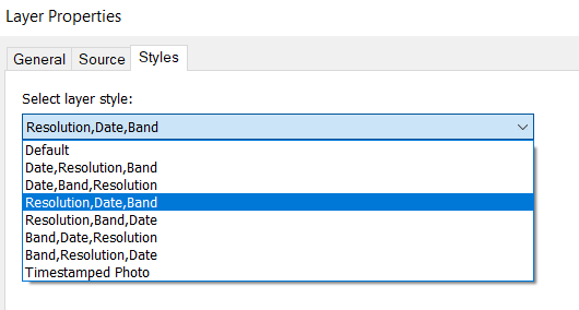 Band, Date, Resolution | STYLES=BRD | All data within the HxGN_Imagery layer is RGBN and equally prioritized. |