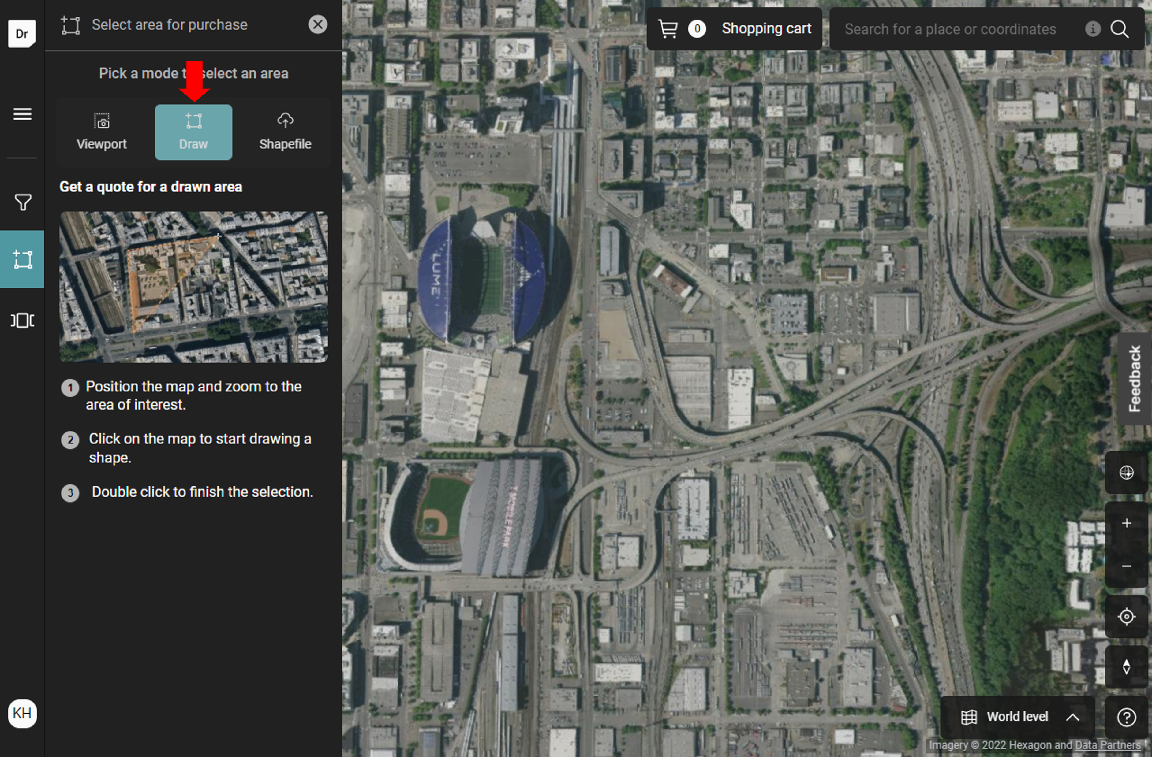 3. On the left-side panel, click on “select area for purchase” and click on “Draw.”