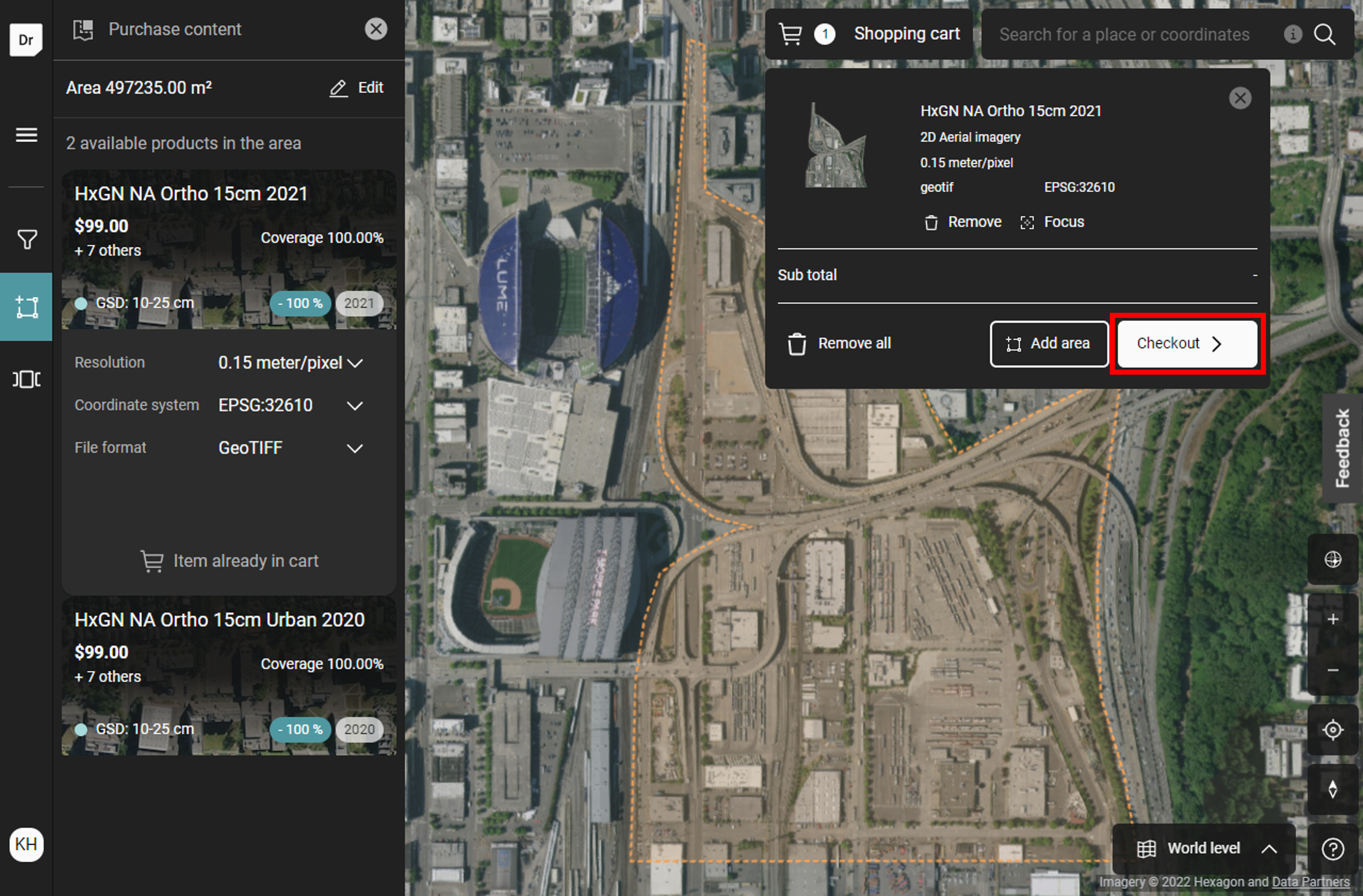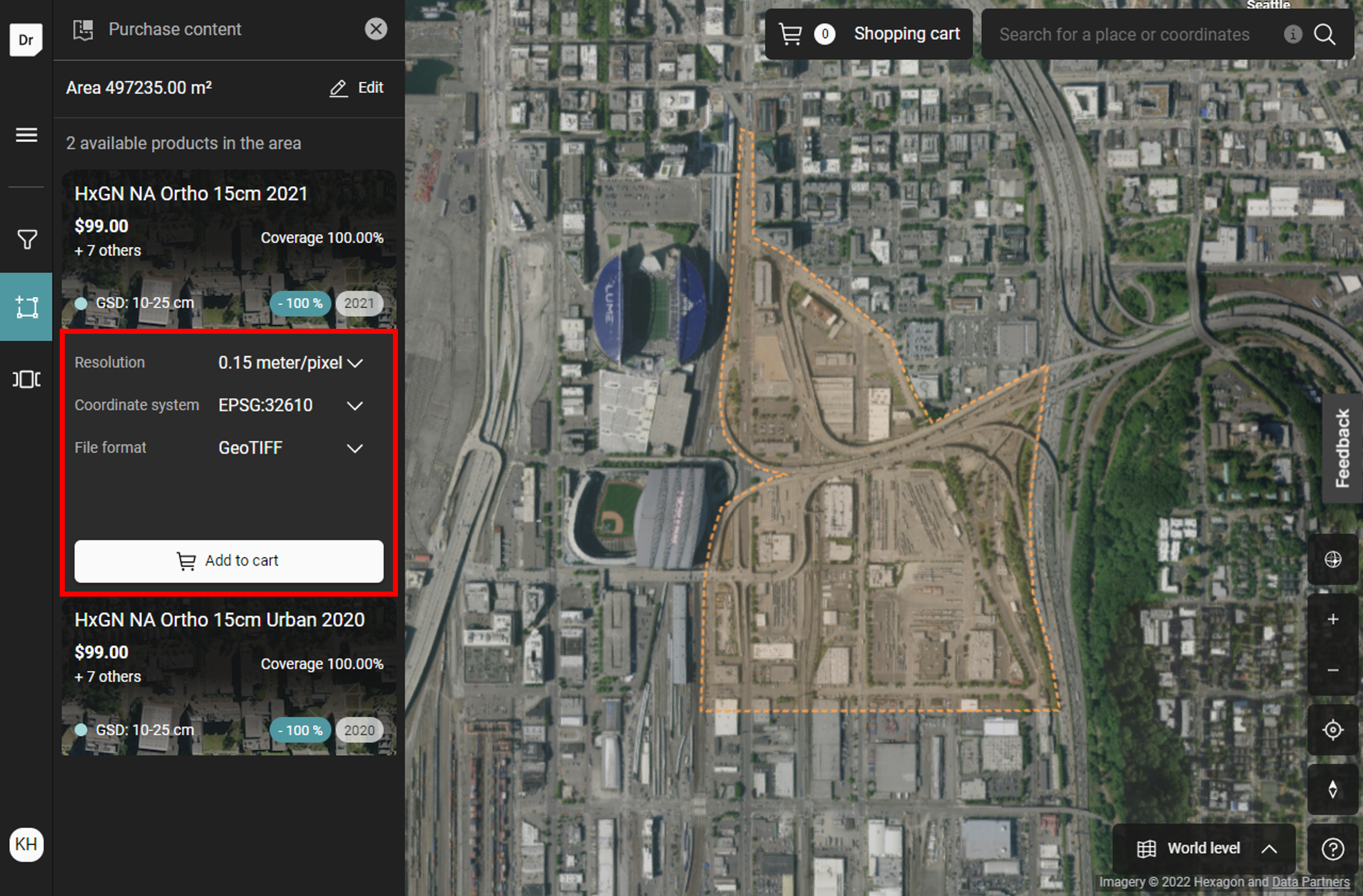 4. Click on the map to draw a shape and double-click to finish the selection. Click on “Edit” to adjust the shape by adding, removing and moving vertices. Then, review details about your selection and make adjustments as needed. Click “Add to cart.”
